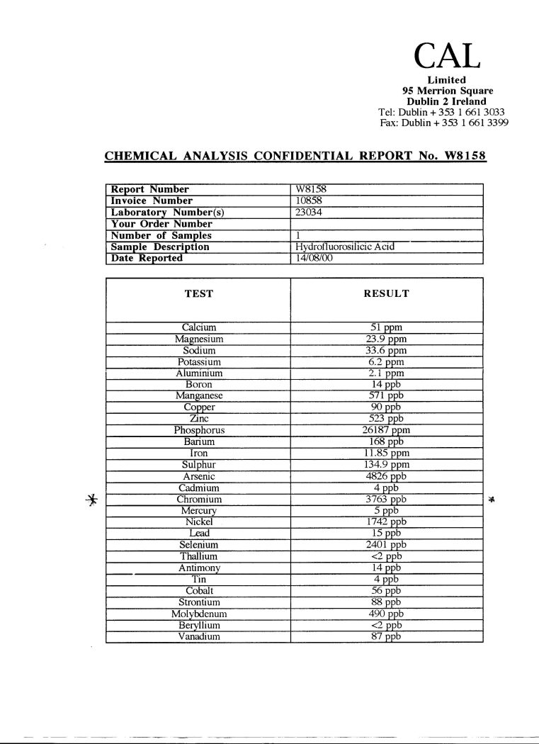 There are many background contaminants in artificial fluorides. The following picture (from Ireland) will give the reader some idea of the toxic chemicals (such as lead, arsenic, mercury) that are present in fluorosilicates:
