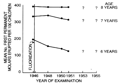 Decline in eruption rate. An observation of considerable interest is obtainable from Tables V and VI of the X Report (Hill, et al., 1952). The former table shows the rates per 100 six, seven and eight-year-old children that had occlusal surface pit and fissure caries or fillings in their first permanent molars; the latter one, the number of these teeth which were free from those defects. The mean number of erupted first permanent molars per 100 children may be obtained, in each age group, by adding these two rates to that showing the extracted and congenitally missing permanent molars. It is probable that the number of congenitally missing teeth was negligible and that the number of permanent molars which had been extracted in these young children was small, particularly in the six years age group (five and a half to six and a half years). Therefore, it would be expected that, in each age group, the mean number of erupted molars per 100 children would be similar at the time of each examination. This was the case in children aged eight years; the figures for the examinations made in 1946 (pre-fluoridation), 1948, 1950 and 1951 being (to the nearest whole number) 387, 387, 384 and 386 respectively. At age seven years the numbers erupted were 330, 336, 320 and 315; but in the six-year-old children, the number of erupted molars showed a marked and progressive decline 189, 156, 140 and 132 during the period covered by those four examinations.
