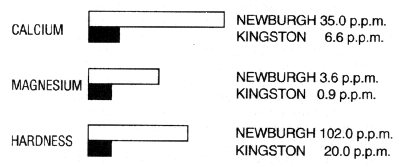 In regard to the composition and other characteristics of these waters, according to analyses of the finished waters made in February 1952 by the U.S. Geological Survey (Lohr and Love, 1954), in each of the ten items - magnesium, sodium, potassium, bicarbonate, sulphate, chloride, dissolved solids, specific conductance, hardness and alkalinity - the values for the Newburgh water were at least four times as great as those obtained from analysis of the Kingston supply. In the very important matter of the calcium content, the Newburgh value of 35 ppm (Ca) was more than five times as large as that of the Kingston one of 6.6 ppm (Ca). Changes in the supplies during the period of the trial, owing to natural or to treatment-chemical variations, are unlikely to have affected these gross differences more than slightly.