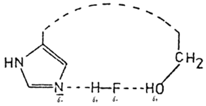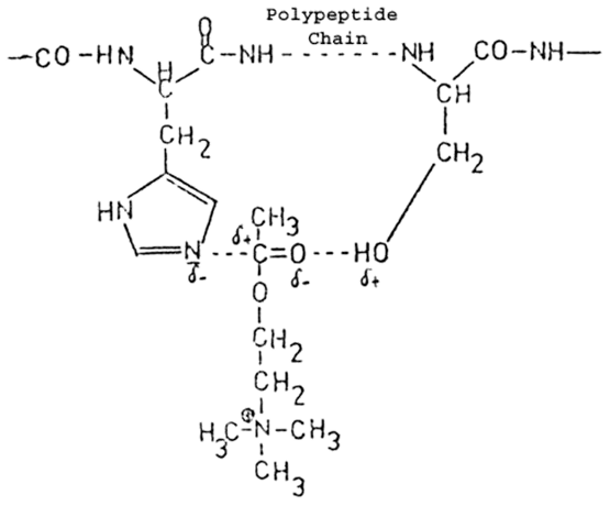 According to a hypothesis posited by Barlow(25), the ester group of the ACh is fixed to the N atom of a histidine residue and to the OH group of a serine residue by way of a dipole bond.